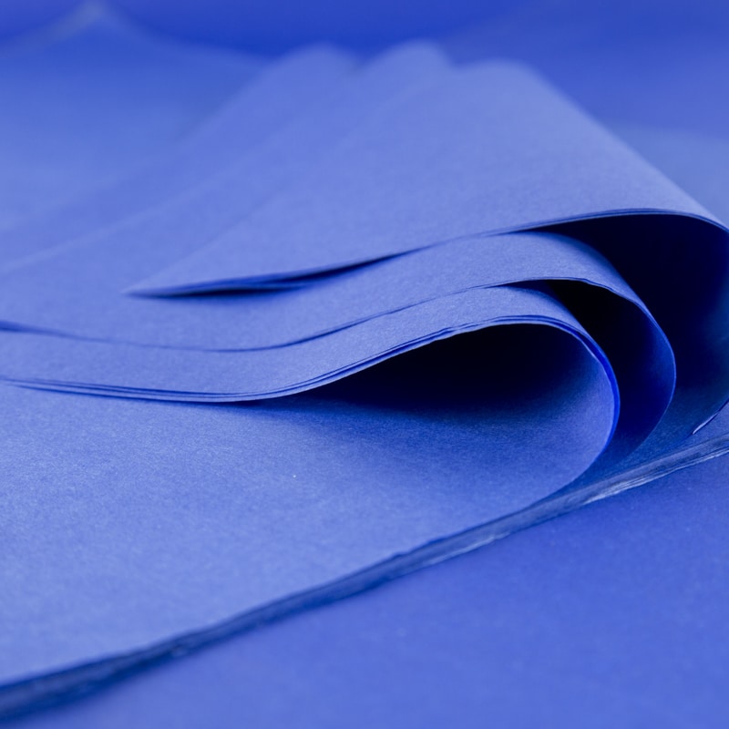 Le papier de soie standard Bleu Roy est d’un bleu soutenu avec une légère transparence.